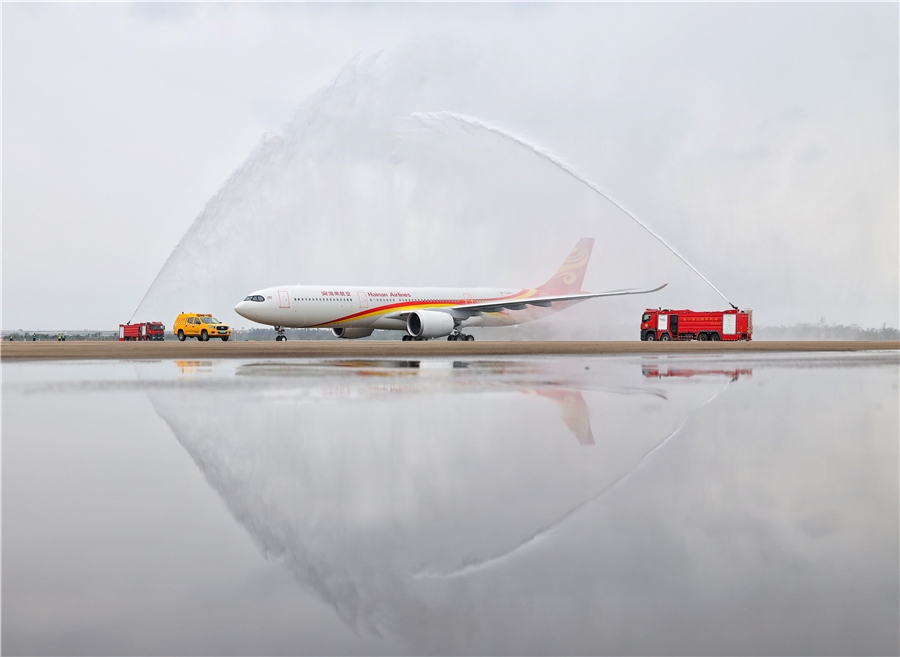当天上午,海南航空在海口美兰国际机场举行了隆重的接机仪式。A330新飞机抵达后,穿越了象征民航最高礼遇的“水门礼”,正式入列海南航空机队。空中客车全球执行副总裁兼中国公司首席执行官徐岗,辽宁方大集团董事、执行总裁兼党委副书记刘一男,辽宁方大集团高级副总裁兼海航航空集团董事长丁拥政,海航航空集团副总裁兼海南航空董事长祝涛,海航航空集团副总裁兼海南航空党委书记桂海鸿,海南航空总裁余超杰,海南航空副总裁郭烁及媒体记者代表等出席了此次接机仪式,共同见证这一重要时刻。