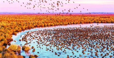 黑龙江省挠力河国家级自然保护区,候鸟在晨光中翔集。新华社发