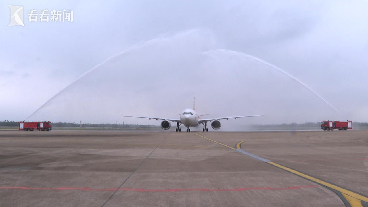 11月1日,海南航空一架全新空客A330飞机顺利降落在海口美兰国际机场,并计划于近期正式投入运营。飞机抵达后,穿越了象征民航最高礼遇的“水门礼”,正式入列海南航空机队。