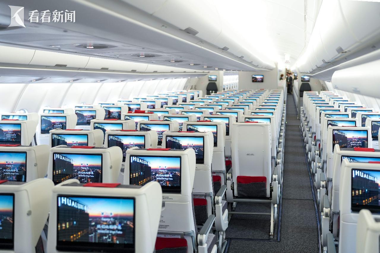 该飞机共设301个座位,其中公务舱24个座位,经济舱277个座位,公务舱采用了1-2-1交错式布局,经济舱座椅间距达30-34英寸。其中,经济舱座椅选用了航空工业的国产座椅,这也是国产座椅首次被纳入国际主流宽体机选型目录。机上还配备了4K超高清屏幕,且全舱支持高功率USB-C接口和蓝牙连接。