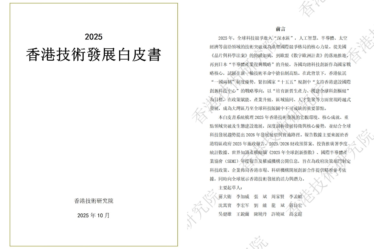 OCR:前言 2025 2025年,全球科技装予选入“深水區”,人工智慧、半尊髓、太空 香港技術發展白皮書 妞济等前沿领域的技術突破成為重型成原效争格局的核心力量。美网 《品片舆科学法案》的持斌如码,到歌盟《数字歌洲计盖》的落地推地 再到日本“半得髓產聚很典哦略”的升级,各國均路科技创新作為國家载 略核心,試国在新输技術革命中拾估制高站,在此背景下,香港依托 “一國雨制”利度俊势,繁扣阅家“十五五”规制中“支持香港建設國原 创新科技中心”的哦略尊向,以“培育新贺生座力、槐建全球科剖概细” 为日检,在政策腻能、票升级、區域培同、人才集聚等方面官现跨越式 發展,成為大湾區乃至全球科技版国中不可或缺的重要部點。 本白皮害系统植理2025年香港技術微展的宏觀增境、核心成就、重 贴领域突破及生娜建設进展,深度润析会展特微與核心俊势,登结合全球 科技發展趣势提出2026年發展展组與實施路径,报告数據主要来源於香 港特區政府2025年施政银告、2025/2026财政预算案、投资推膚署季度 统計数、世界知流细绩(2025年全球创新指数》、网磨半尊 案會(SEMI)年政银告及權或楼横公用信息,旨在為政府决策部门制定 科技政策、企案饰局香港市場、科研横開展制新合作提供精准象考依 。同時向全球展示香港技術發展的活力與酒力。 1 主要起草人 香港技術研究院 蒋大衡李加威张斌周家贤李孟额 沈寓贵李宏军到维龍斌宏 2025年10月 吴健雄王南陵晓丹許晓斌高文超