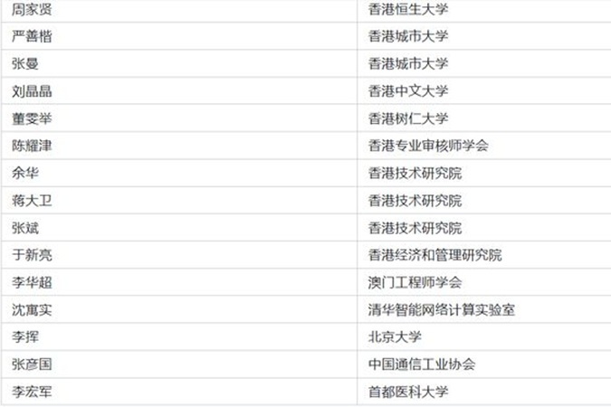 OCR:周家贤 香港恒生大学 严善楷 香港城市大学 张曼 香港城市大学 刘晶晶 香港中文大学 董雯举 香港树仁大学 陈耀津 香港专业审核师学会 余华 香港技术研究院 蒋大卫 香港技术研究院 张斌 香港技术研究院 于新亮 香港经济和管理研究院 李华超 澳门工程师学会 沈寓实 清华智能网络计算实验室 李挥 北京大学 张彦国 中国通信工业协会 李宏军 首都医科大学