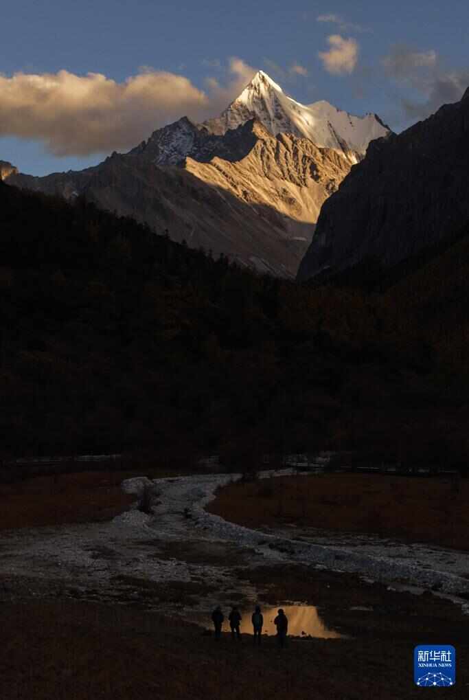 日落时分,夏诺多吉雪山倒映在水中(10月26日摄)。