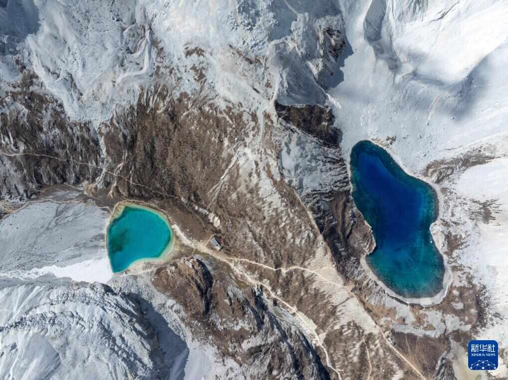 俯瞰稻城亚丁景区的五色海(右)和牛奶海(10月27日摄,无人机照片)。