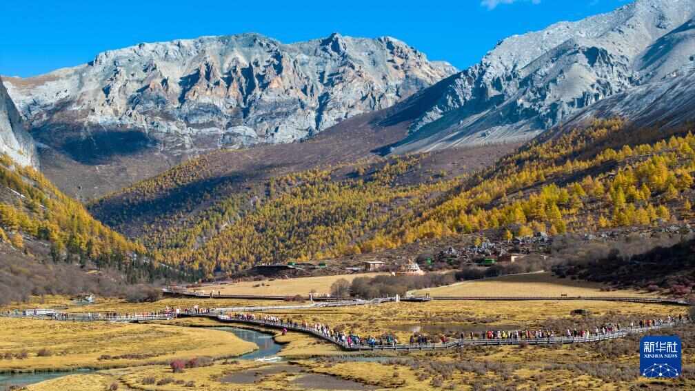 游人走在稻城亚丁景区洛绒牛场步行栈道上(10月29日摄,无人机照片)。