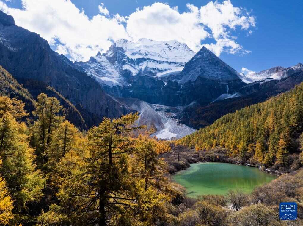 稻城亚丁景区波拥措和三座雪山同框(10月28日摄,无人机照片)。