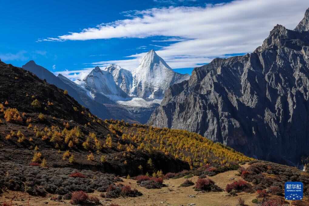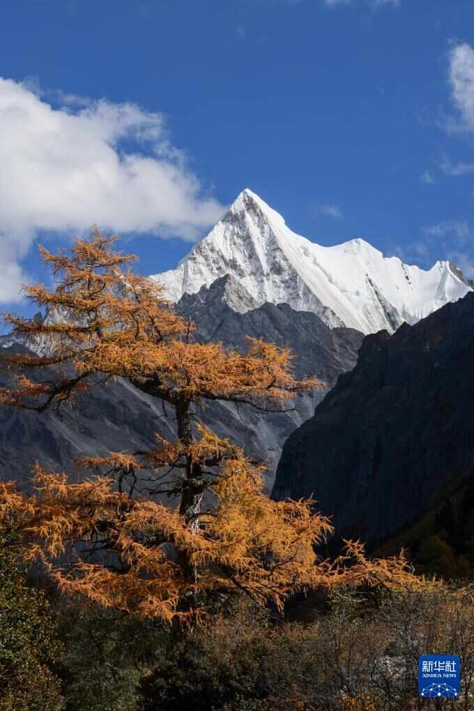 远眺夏诺多吉雪山,蓝天白云、雪山与彩林相互映衬(10月26日摄)。