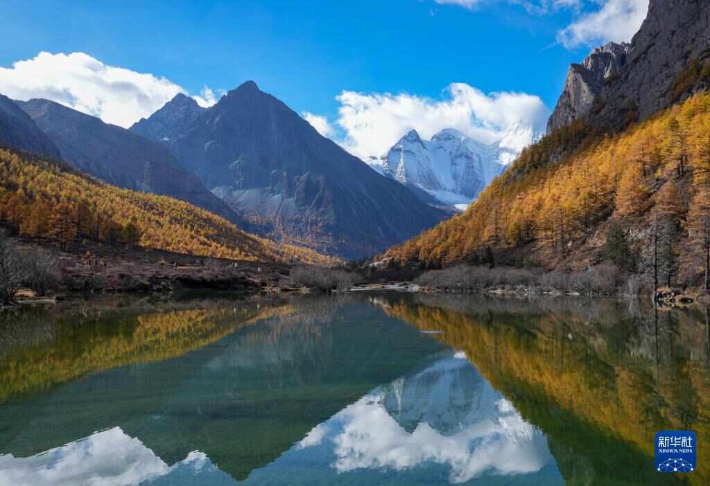 蓝天白云、雪山和彩林倒影在稻城亚丁景区圣水湖中(10月29日摄)。