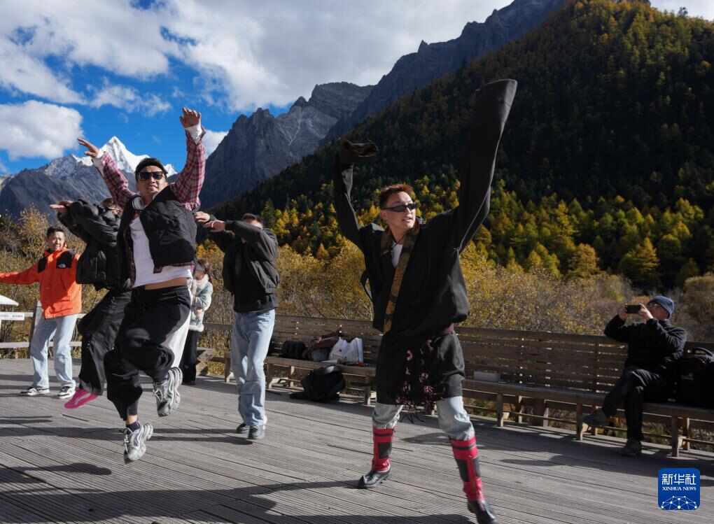 几位藏族小伙子和游客一起在冲古寺草甸前跳锅庄(10月26日摄)。