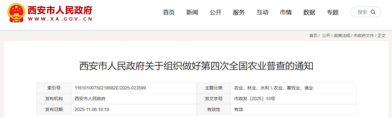 OCR:西安市人民政府 首页 新闻 公开 服务 互动 市情 数据 专题 搜索Q WWW.XA.GOV.CN 首页/公开/政法规/市政府文件/正文 西安市人民政府关于组织做好第四次全国农业普查的通知 索号 11610100750218682E/2025-023599 主题分类 农业、林业、水利农业、富牧业、渔业 发布机构 西安市人民政府 发文字号 市政发[2025]10号 发布日期 2025-11-06 10:19 有效性 有效
