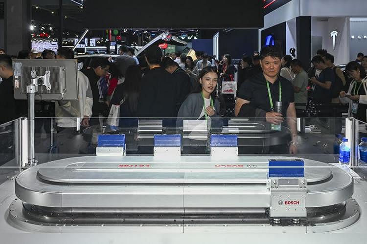 Visitors view LeTrak, a magnetic drive conveyance system of Bosch, at the Automobile exhibition area of the eighth China International Import Expo (CIIE) in east China’s Shanghai, Nov. 6, 2025. (Xinhua/Chen Haoming)