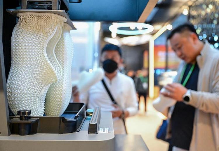 A pair of 3D-printed shoes is pictured at the Intelligent Industry and Information Technology exhibition area of the eighth China International Import Expo (CIIE) in east China’s Shanghai, Nov. 6, 2025. (Xinhua/Cai Xiangxin)