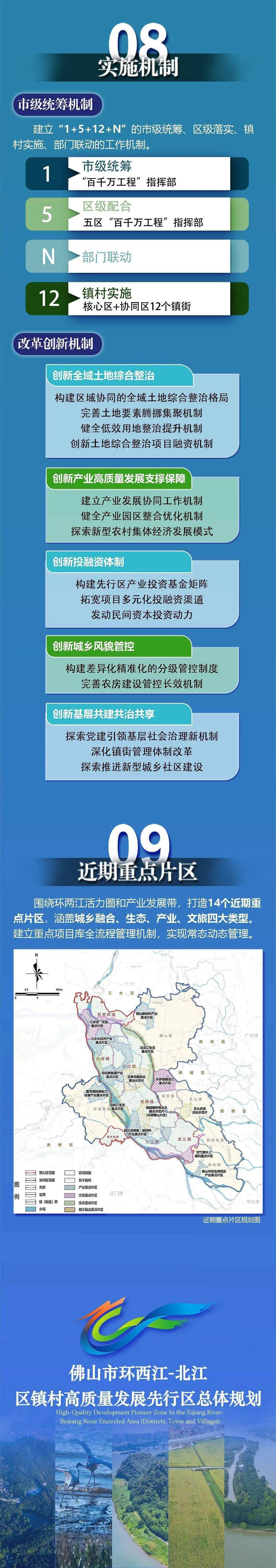 OCR:08 实施机制 市级统筹机制 建立 “1+5+12+N”的市级统筹、 区级落实、镇 村实施、部门联动的工作机制。 市级统筹 1 “百千万工程” 指挥部 区级配合 5 五区“百千万工程”: 指挥部 N 部门联动 12 镇村实施 核心区+协同区12个镇街 改革创新机制 创新全域土地综合整治 构建区域协同的全域土地综合整治格局 完善土地要素腾挪集聚机制 健全低效用地整治提升机制 创新土地综合整治项目融资机制 创新产业高质量发展支撑保障 建立产业发展协同工作机制 健全产业园区整合优化机制 探索新型农村集体经济发展模式 创新投融资体制 构建先行区产业投资基金矩阵 拓宽项目多元化投融资渠道 发动民间资本投资动力 创新城乡风貌管控 构建差异化精准化的分级管控制度 完善农房建设管控长效机制 创新基层共建共治共享 探索党建引领基层社会治理新机制 深化镇街管理体制改革 探索推进新型城乡社区建设 09 近期重点片区 围绕环两江活力圈和产业发展带,打造14个近期重 点片区,涵盖城乡融合、生态、产业、文旅四大类型。 建立重点项目库全流程管理机制,实现常态动态管理。 西南街道 几字湾文旅 重点片区 水水经济产业 山镇 广州市 重点片区 沿北江生态 白妮镇 丹灶镇 丹白新能源产业 重点片区 沿季华路综合 牌 盗治示范片 高湾龙能的电力 备 业重点片区 南庄镇 西椎镇 乐从镇 沿西江生态 桑园围岭南水乡 融合示范片 乐从历史 (环西桃山片区) 活化示范片 地装备、新材料 业重点片区 九江抓 龙江镇 勒流街道 V P 甘节滩水上 潮玩重点片区 坛镇 核心区范团 区域铁路 佛山市综合保税区 产业重点片区 助同区范围 骨干路网 客 市界 产业重点片区 R 区界 800888 文旅金点片区 江门市 镇(街道)界 生态重点片区 中山市 水城 城乡胎合重点片区 近期重点片区规划图 佛山市环西江-北江 区镇村高质量发展先行区总体规划 High-QualityDevelopmentPioneerZoneIntheXijiangRiver- BeijiangRiver Encircled Area (Districts,Town andVillages)