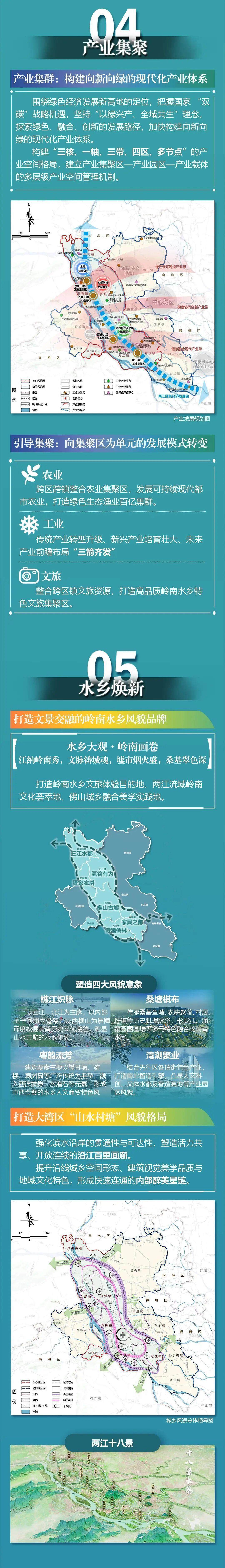 OCR:04 产业集聚 产业集群:构建向新向绿的现代化产业体系 围绕绿色经济发展新高地的定位,把握国家“双 碳”战略机遇,坚持“以绿兴产、全域共生”理念 探索绿色、融合、创新的发展路径,加快构建向新向 绿的现代化产业体系。 构建“三核、一轴、三带、四区、多节点”的产 业空间格局,建立产业集聚区一产业园区一产业载体 的多层级产业空间管理机制。 市级副中心 绿色未来制造产业带 苏山镇 广州市 (佛北) 仙湖科技 西南·白城 工业集聚区 白妮镇 丹灶镇智 丹灶·白 安全产业 中心城区 梯度协同创新产业带 佛山斯城 产业 乐从镇 西桃山生态文 西栋九江 创新接心 造产业 低碳融合现代产业带 九江镇 龙江镇 勒流街道 九江-龙江 工业集聚区 市级副中心 湖文旅集聚 (犬良:容桂伦教 咨坛镇 核心区范围 日 区域铁路 农业产业节点 协同区范围 二 骨干路网 。 图 工业产业节点 工业集聚区 级务业产业节点 区界 ? 创新核心 两江绿色经济发展轴 例 镇(街道)界 二 产业联动带 中山市 水域 产业发展轴 产业发展规划图 引导集聚:向集聚区为单元的发展模式转变 农业 跨区跨镇整合农业集聚区,发展可持续现代都 市农业,打造绿色生态渔业百亿集群。 工业 传统产业转型升级、新兴产业培育壮大、未来 产业前瞻布局“三箭齐发 文旅 整合跨区镇文旅资源,打造高品质岭南水乡特 色文旅集聚区。 05 水乡焕新 打造文景交融的岭南水乡风貌品牌 水乡大观·岭南画卷 江纳岭南秀,文脉铸城魂,墟市烟火盛,桑基翠色深 打造岭南水乡文旅体验目的地、两江流域岭南 文化荟萃地、佛山城乡融合美学实践地 三江水都 灶编 氢谷有为 家农耕 樵山古城 家具之都 九江 诗酒儒林 塑造四大风貌意象 樵江织脉 桑塘棋布 以西江 传承桑基鱼塘、农耕聚落、村居、 主干河涌为骨架以西樵山为屏障,圩镇等历史肌理脉络,形成江、涌 深度挖掘岭南历史文化底蕴:彰显 山水共融的水乡印象 7K 子 粤韵流芳 湾潮聚业 建筑要素主要以耳墙、骑 结合先行区各镇街特色产业 楼、满洲窗等广府传统为典型,融 打造南北智造引擎,凸显人科 入西洋拱券、水磨石等元素,形成色 创、文体水都及智造高地等产业园 中西合璧的水乡人文商贸特色风 区风貌。 打造大湾区“山水村塘”风貌格局 强化滨水沿岸的贯通性与可达性,塑造活力共 享、 开放连续的沿江百里画廊。 提升沿线城乡空间形态、建筑视觉美学品质与 地域文化特色,形成快速连通的内部醉美星链。 山镇 广州市 + 白烧镇 丹灶镇 G + 生态道 南庄镇 城街 龙江镇 勤流街道 二 按心区范围 区域铁路 咨绘镇 物同区范围 三 骨干路网 图 界 1 百里通 例 区界 醉美星链 江门市 镇(衍道)界 十八最 中山市 水域 城乡风貌总体格局图 两江十八景 Y