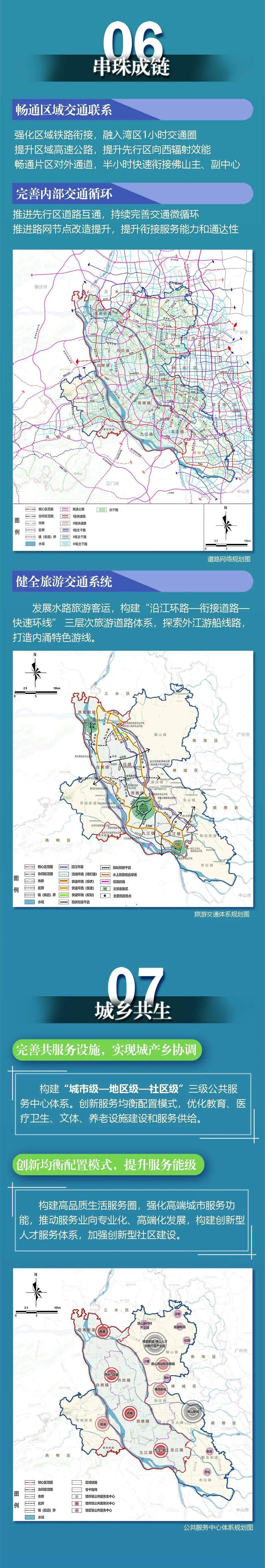 OCR:06 串珠成链 畅通区域交通联系 强化区域铁路衔接,融入湾区1小时交通圈 提升区域高速公路,提升先行区向西辐射效能 畅通片区对外通道,半小时快速衔接佛山主、副中心 完善内部交通循环 推进先行区道路互通, 持续完善交通微循环 推进路网节点改造提升,提升衔接服务能力和通达性 肇庆市 州市 880 江门市 中山市 一 核心区范围 高速公路 次干路 协同区范围 印 级快速路 图 市界 印 级快速路 例 区界 I 级主干路 ” 镇(街道)界 目 级主干路 水域 级主干路 10kn 道路网络规划图 健全旅游交通系统 发展水路旅游客运,构建“沿江环路一衔接道路 快速环线” 三层次旅游道路体系,探索外江游船线路 打造内涌特色游线。 山镇 广州市 江镇 勒流街道 核心区范围 沿江环路 规划衍接干道 香坛镇 协同区范围 治线环线(待打通) 一 水上旅游客运岸线 各 市界 快速环线(现状) 客波筑线 例 区界 快速环线(在建) 文旅集聚区 镇(街道)界 快速环线(规划) []主要旅游股点 中山市 水域 现状衍接干道 旅游交通体系规划图 07 城乡共生 完善共服务设施,实现城产乡协调 构建“城市级一地区级一社区级”三级公共服 务中心体系。创新服务均衡配置模式,优化教育、医 疗卫生、文体、养老设施建设和服务供给。 创新均衡配置模式,提升服务能级 构建高品质生活服务圈,强化高端城市服务功 能,推动服务业向专业化、高端化发展,构建创新型 人才服务体系,加强创新型社区建设。 师山新材料 产业 发新城博 创新灯塔产业园 广州市 丹灶镇 罗村 白妮镇 南庄镇 桃锁 龙江镇 九江镇 核心区范围 区域铁路 杏坛镇 动同区范围 一 骨干路网 图 市界 城市级公共服务主中心 例 区界 城市级公共服务次中心 镇(街道)界 ? 地区级公共服务中心 中山市 水城 公共服务中心体系规划图