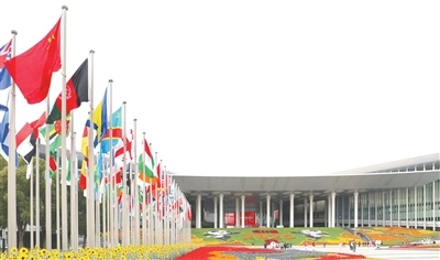第八届进博会举办地国家会展中心(上海)南广场上,参展国国旗飘扬。本报记者 岳林炜摄