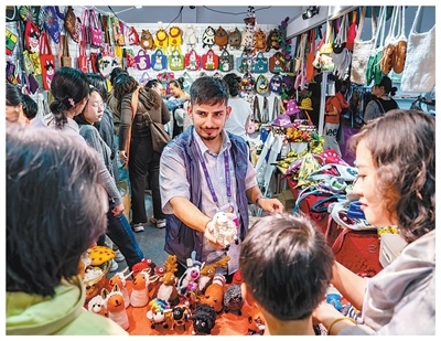 第九届中国—南亚博览会南亚馆尼泊尔展区的参展商向观众推介特色商品。新华社记者 胡 超摄