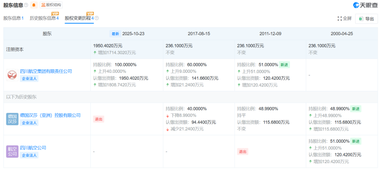 OCR:股东信息 富权结构 天眼查 股东信息1 全屏 导出 股东 最新2025-10-23 2017-08-15 2011-12-09 2000-04-25 1950.4020万元 236.1000万元 236.1000万元 注册资本 236.1000万元 增01714.302077 不变 不夜 不变 持股比例:100.0000% 持股比例:60.0000% 持股比列:51.0000%新进 四川航空集团有限责任公司 上开40.0000% 上开9.0000% 上升51.0000% 企业法人 认缴出资额:1950.4020万元 认您出资额:141.6600万元 认级出资额:120.4200万元 增拟1808.7420万元 增加021.2400万元 超加0120.4200万元 以下为历史股东 持股比例:40.0000% 持股比别:48.9900% 持股比例:48.9900%新进 德国汉莎(亚洲)控段有限公司 下降8.9900% 特平 上升48.9900% 企业法人 认级出资额:94.4400万元 认级出资额:115.6800万元 认出资额:115.6800万元 减少21.24007元 不变 增加115.6800万元 持比例:51.0000%新 四川航控公司 上开51.0000% 企业法人 认缴出资额:120.4200万元 增加120.4200万元