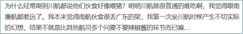 OCR:为什么经常刷到川航都说他们伙食好像喂猪?明明航就很普通的难吃啊,我觉得跟南 廉航都差远了。我本来觉得南航伙食很丢广东的架,我第一次坐川航时候产生不切实际 的幻想,结果不就是比其他航司多个问要不要辣椒酱的环节而已嘛.