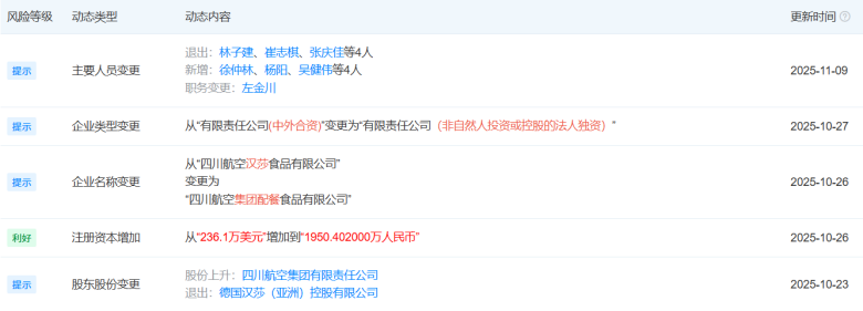 OCR:风险等级 动态类型 动态内容 更新时间 退出:林子建、崔志棋、张庆佳等4人 提示 主要人员变更 新增:徐仲林、杨阳、吴健伟等4人 2025-11-09 职务变更:左金川 提示 企业类型变更 从“有限责任公司(中外合资)变更为有限责任公司(非自然人投资或控股的法人独资) 2025-10-27 从四川航空汉莎食品有限公司 提示 企业名称变更 变更为 2025-10-26 四川航空集团配淄食品有限公司 利好 注册资本增加 从“236.1万美元增加到1950.402000万人民币 2025-10-26 股东股份变更 股份上升:四川航空集团有限责任公司 退出:德国汉莎(亚洲)控股有限公司 2025-10-23