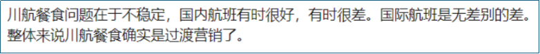 OCR:川航餐食问题在于不稳定,国内航班有时很好,有时很差。国际航班是无差别的差。 整体来说川航餐食确实是过度营销了。