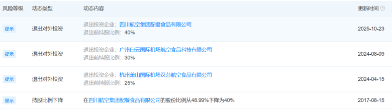 OCR:风险等级 动态类型 动态内容 更新时间 退出投资企业:四川航空集团配餐食品有限公司 提示 退出对外投资 退出前持股比例:40% 2025-10-23 退出对外投资 退出投资企业:广州白云国际机场航空食品科技有限公司 提示 退出前持股比例:30% 2024-08-09 退出对外投资 退出投资企业:杭州萧山国际机场汉莎航空食品有限公司 提示 退出前持股比例:25% 2024-04-15 持股比例下降 在四川航空集团配餐食品有限公司的股份比例从48.99%下降为40% 2017-08-15