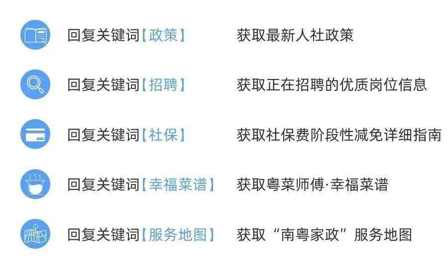 OCR:回复关键词【政策】 获取最新人社政策 回复关键词【招聘】 获取正在招聘的优质岗位信息 回复关键词【社保】 获取社保费阶段性减免详细指南 回复关键词【幸福菜谱 获取粤菜师傅·幸福菜谱 福 回复关键词【服务地图】 获取“南粤家政”服务地图