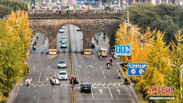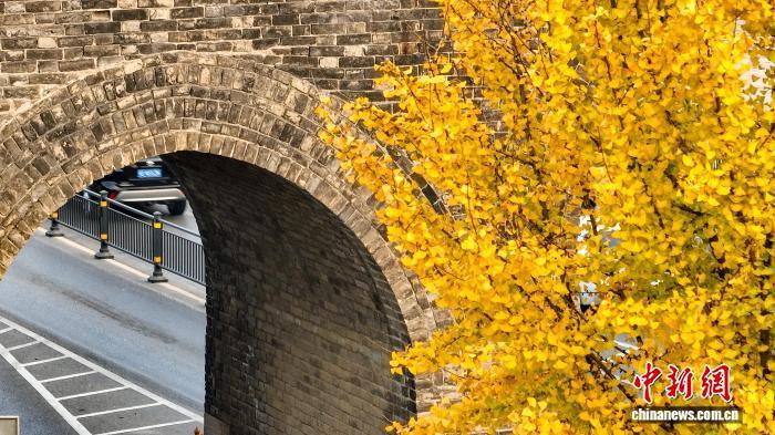 图为金黄的银杏叶与古老城墙相映成趣。(无人机图片)吴淘淘 摄