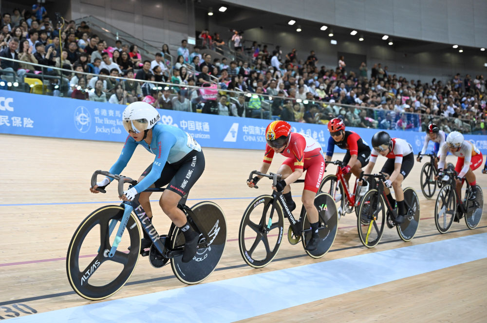 ↑11月17日,冠军香港队选手李思颖(左一)在场地自行车女子全能赛记分赛中。
