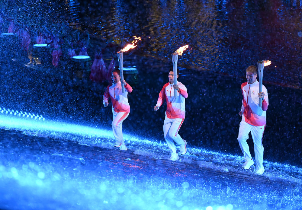 ↑11月9日,火炬手苏炳添(中)、张家朗(右)、李祎在开幕式现场跑向主火炬。