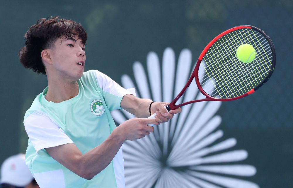 ↑11月9日,澳门队选手何锶朗在网球青年组男子团体第1轮单打比赛中回球。