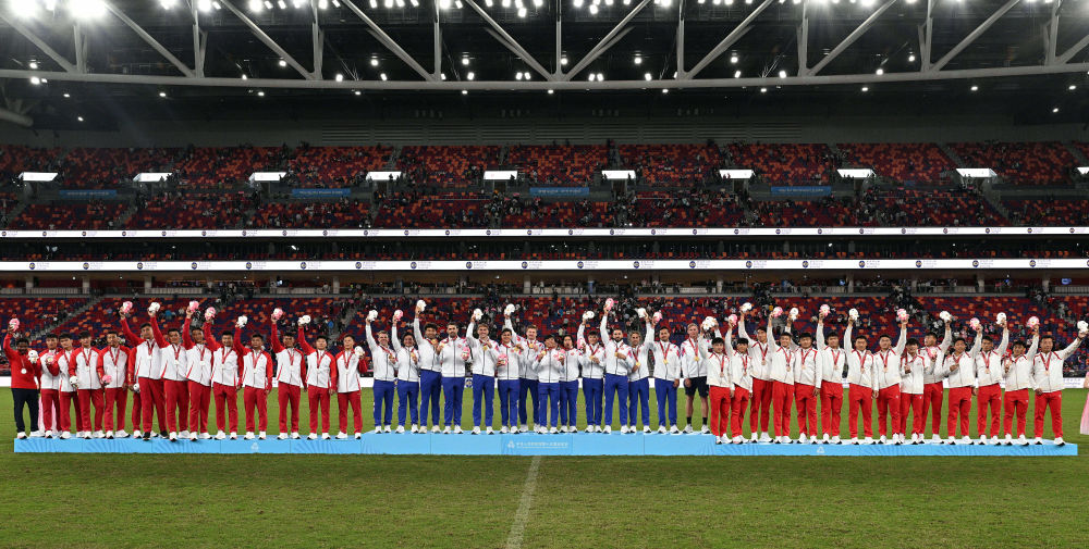 ↑11月19日,香港队选手和教练在男子花剑团体金牌赛夺冠后向观众致意。