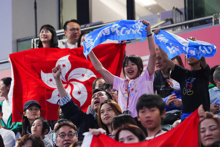 ↑11月16日,观众在击剑男子花剑个人铜牌赛现场为香港队选手张家朗加油。