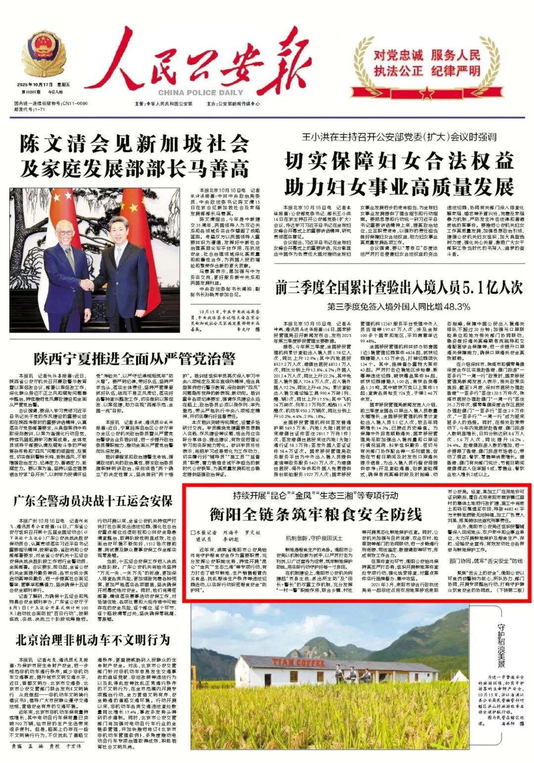 OCR:民么安 对党忠诚服务人民 执法公正纪律严明 2025年10月17日星期 人 CHINA POLICE DAILY 主管:中华人民大和国公安部 主办:公安影新闻作银中心 陈文清会见新加坡社会 王小洪在主持召开公安部党委(扩大)会议时强调 切实保障妇女合法权益 及家庭发展部部长马善高 来计国北10月1日电日2 助力妇女事业高质量发展 世(火 一习近平日 是力机剧,严的发生冲击运律和面 家. 家 神. 书记要 儿美女加大期 高发展名票工作 登机关组文组,加大 作为责任大国对指动全球 费请话,充分载 账严界打告受妇文会法权组的英出 会议强囊,要以”零春“度体 邮工争当时代的书写人,退梦的码 前三季度全国累计查验出人境人员5.1亿人次 第三季度免签入境外国人同比增48.3% 医 其机13为天次入 提队不过 陕西宁夏推进全面从严管党治警 陕西需公纪类夏:日 护, 助力实现“西解示、坐 动自 办业区公 机的委目量从严营党 登厅 人实民作 付文 全体竞 位 员须导于等费以境应斗争的严 向版 习陶卖 格训家扣政治连警生电, 实项行好 “积责: 服务 提力. 1价奖“0开关”,以树单7 要以家为福,隔神品定理 下 “的成定在文 职身的讲款的, 深期项“两不孩 代公民款制 居 广东全警动员决战十五运会安保 持续开展“昆仑”“金风”“生态三湘”等专项行动 衡阳全链条筑牢粮食安全防线 10月16 点部位投加公共业 FE 营业脑 机期能新,守护良田沃土 业 胜 白R 1512次提 地电业、欢限出 客等门的物网联动,进一步行 所带硬,司定,据调等节,再 、输全直传, 等品 或工作告力 与地保护工作 用 朝门协同,筑牢“舌尖安全“防线 毒 品 集中农路 质为办所 实际行动职银食登全 众下家代全的易牌战 守护 北京治理非机动车不文明行为 民区