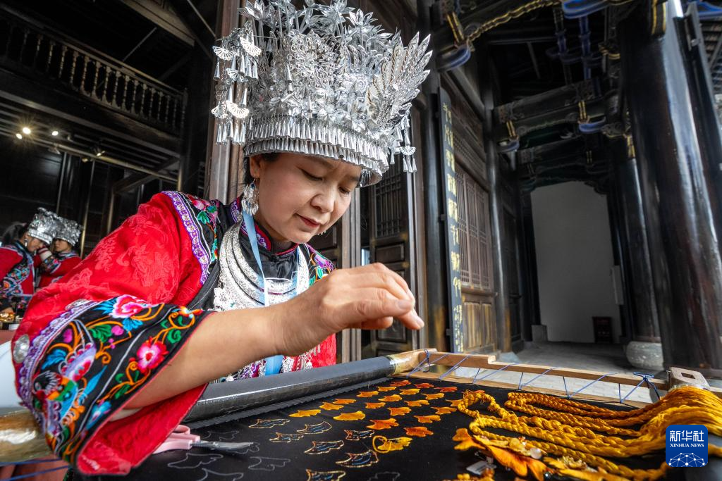 11月23日,重庆酉州苗绣市级传承人陈国桃在2025非遗品牌推广周上刺绣。
