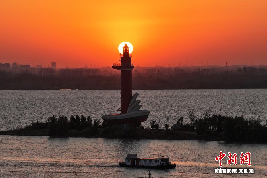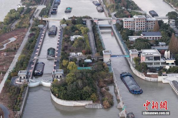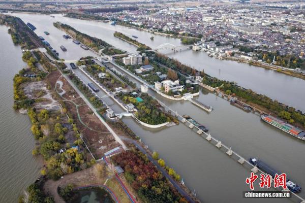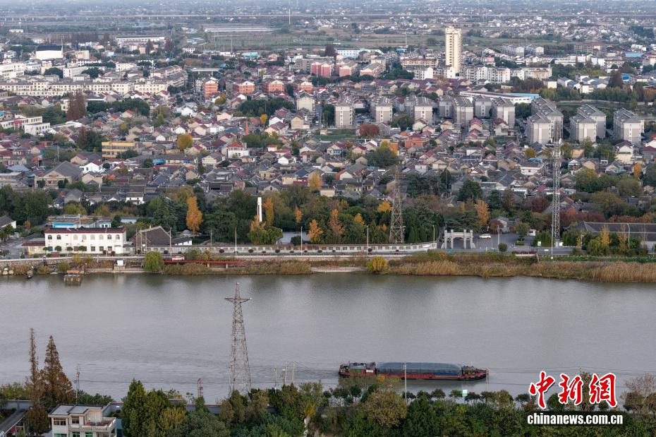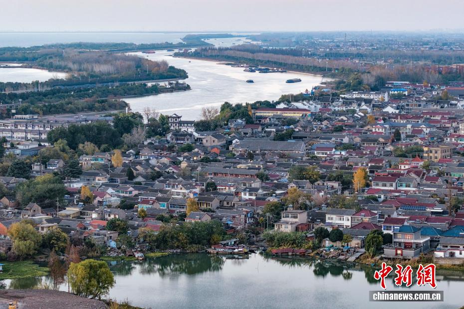 11月25日,江苏扬州,航拍京杭运河畔邵伯古镇。至今已有1600多年历史的邵伯古镇南濒长江、西邻邵伯湖、中贯京杭大运河,在历史上一度成为商贸重镇。(无人机照片)