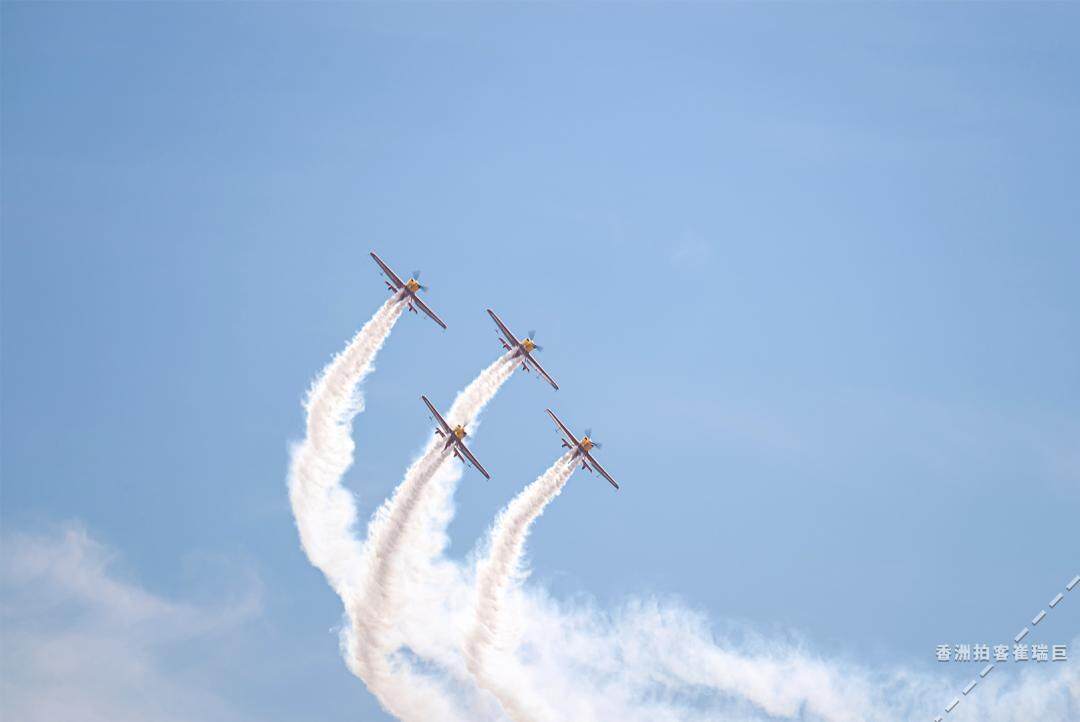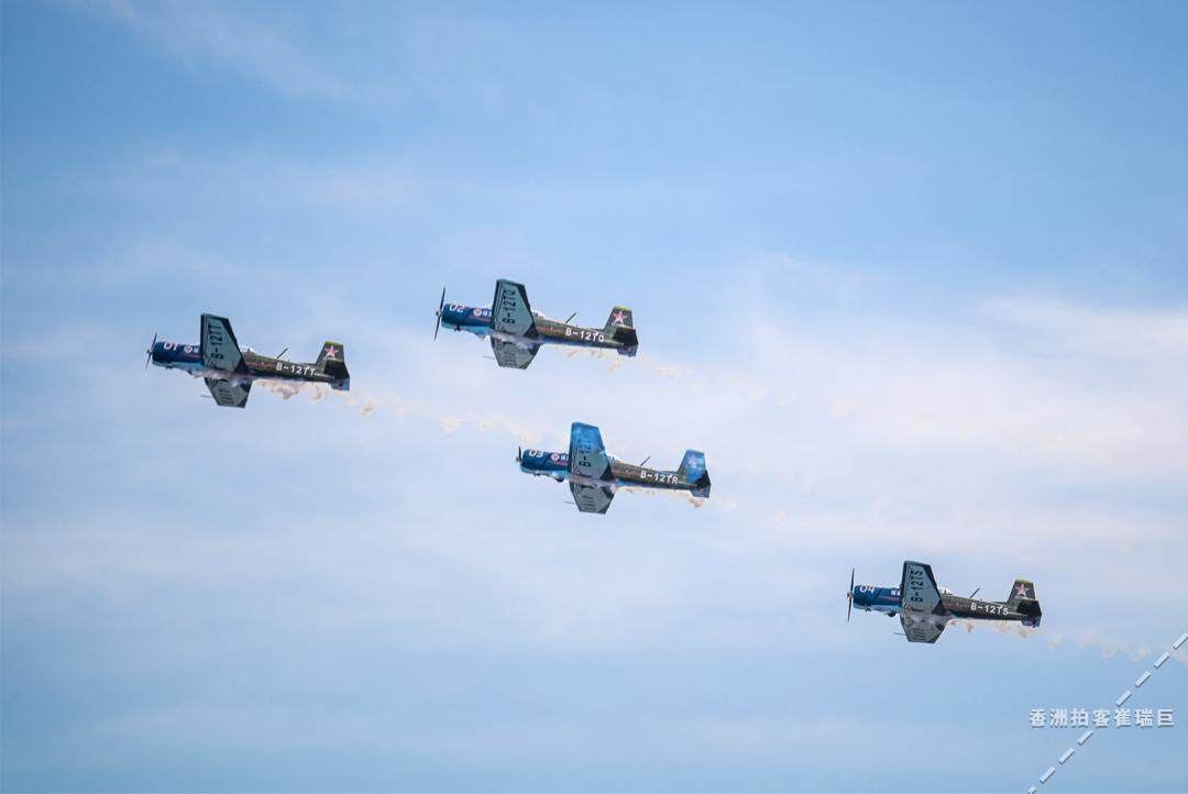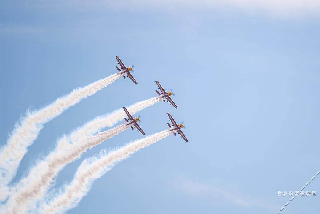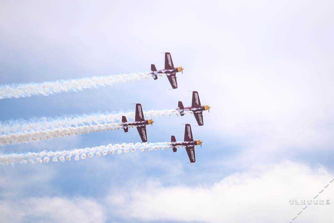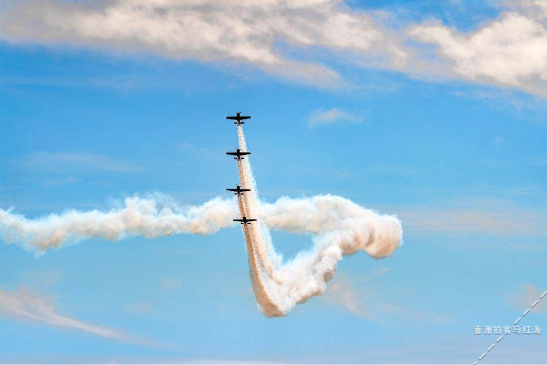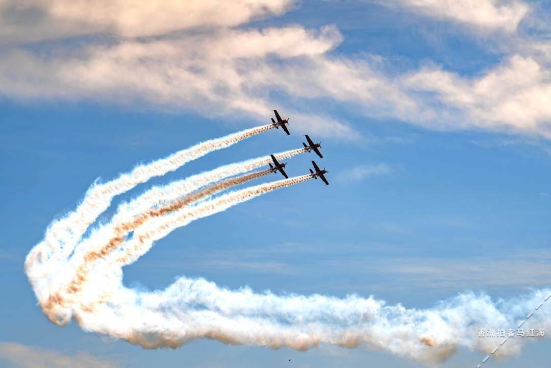 航展期间的飞行表演不容错过!南非“AERO”特技飞行表演队、中国“红星”飞行表演队联手炫舞蓝天,表演落叶飘、低空倒飞、单机双圈尾旋、横八字等飞行动作。