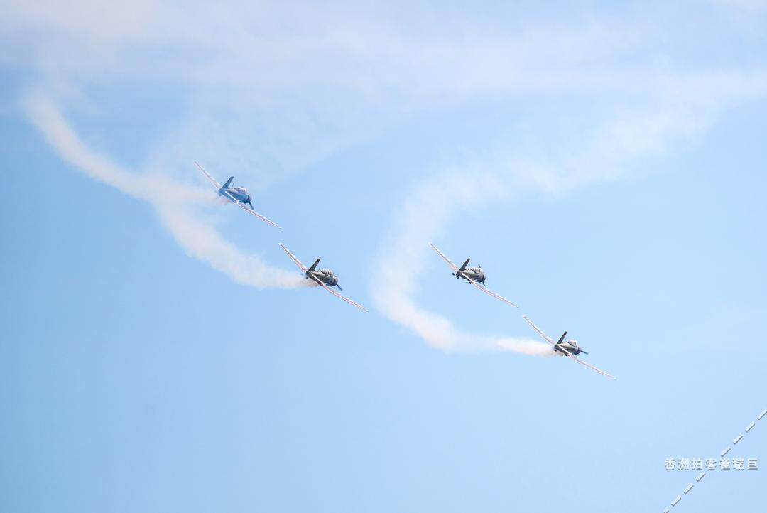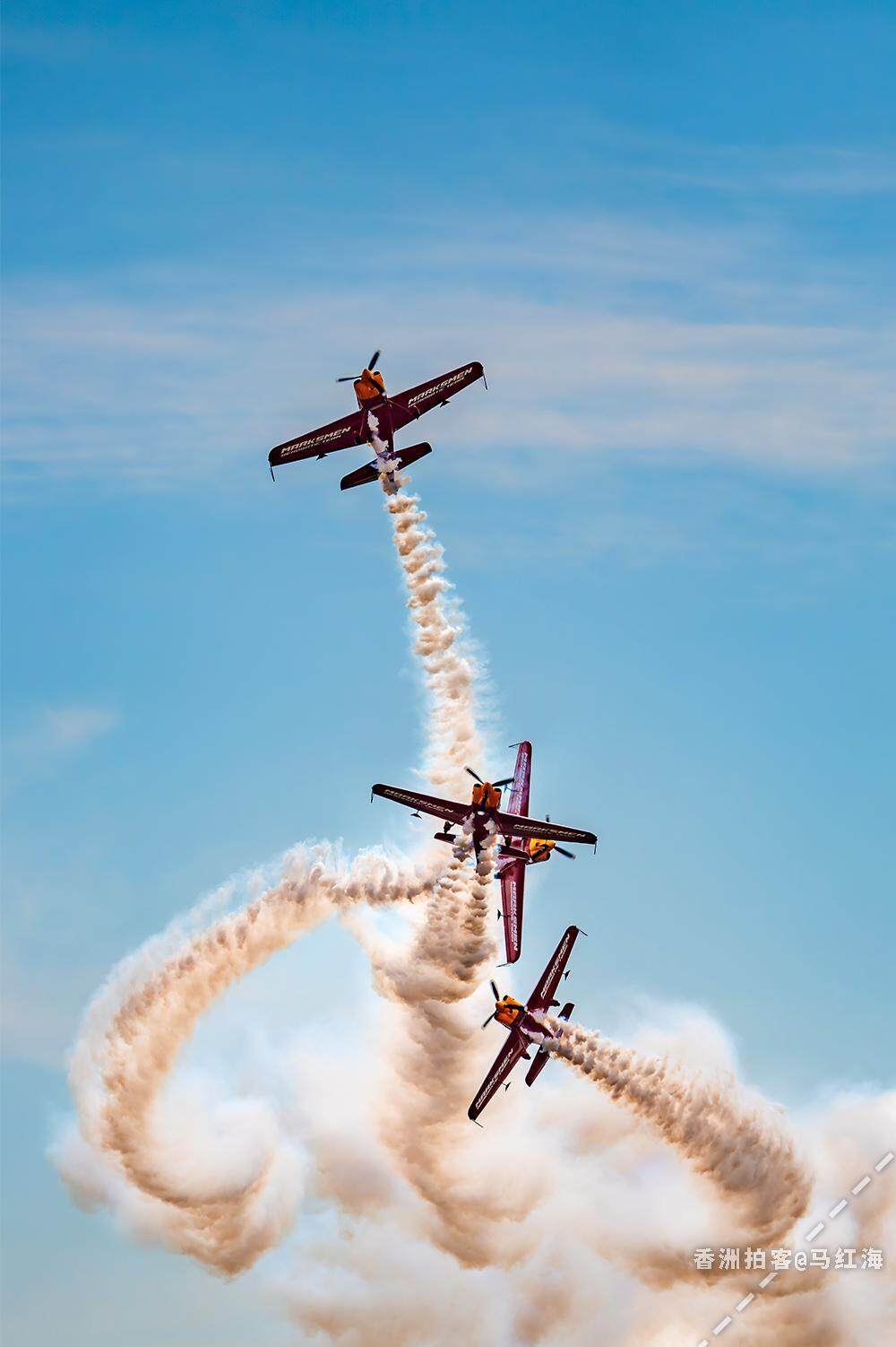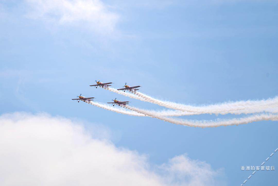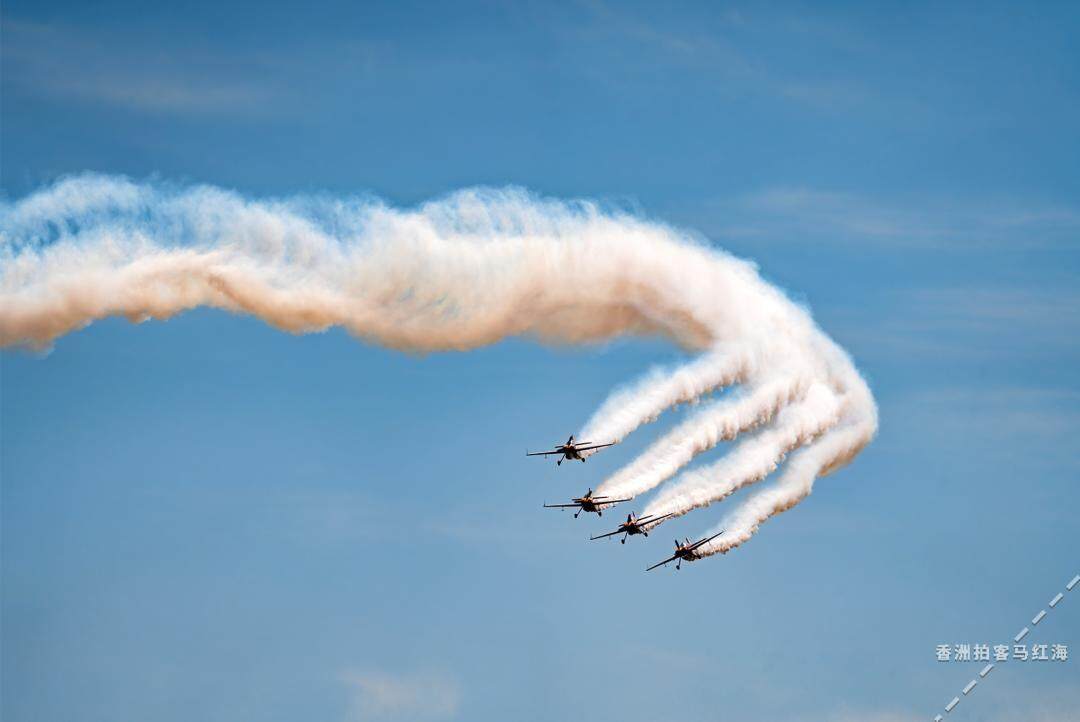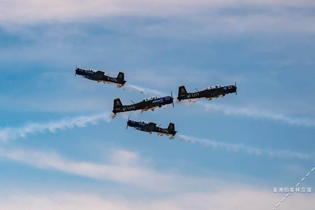 航展期间的飞行表演不容错过!南非“AERO”特技飞行表演队、中国“红星”飞行表演队联手炫舞蓝天,表演落叶飘、低空倒飞、单机双圈尾旋、横八字等飞行动作。