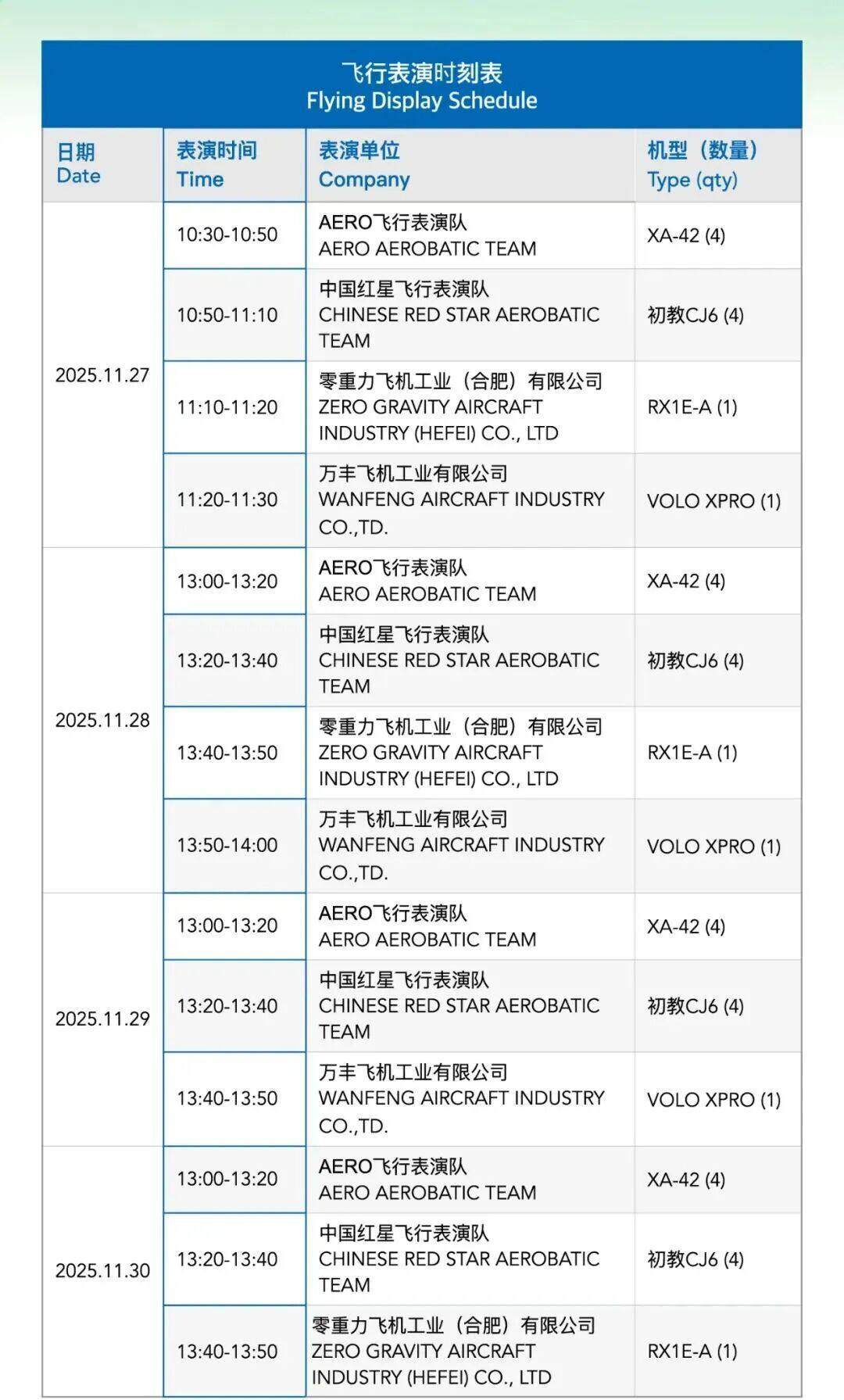 OCR:飞行表演时刻表 FlyingDisplaySchedule 日期 表演时间 表演单位 机型(数量) Date Time Company Type(qty) AERO飞行表演队 10:30-10:50 XA-42 (4) AEROAEROBATICTEAM 中国红星飞行表演队 10:50-11:10 CHINESEREDSTARAEROBATIC 初教CJ6(4) TEAM 2025.11.27 零重力飞机工业(合肥)有限公司 11:10-11:20 ZEROGRAVITYAIRCRAFT RX1E-A(1) INDUSTRY(HEFEI)CO.,LTD 万丰飞机工业有限公司 11:20-11:30 WANFENGAIRCRAFTINDUSTRY VOLOXPRO(1) CO.,TD. AERO飞行表演队 13:00-13:20 XA-42 (4) AEROAEROBATICTEAM 中国红星飞行表演队 13:20-13:40 CHINESEREDSTARAEROBATIC 初教CJ6(4) TEAM 2025.11.28 零重力飞机工业(合肥)有限公司 13:40-13:50 ZEROGRAVITYAIRCRAFT RX1E-A (1) INDUSTRY(HEFEI)CO.,LTD 万丰飞机工业有限公司 13:50-14:00 WANFENGAIRCRAFTINDUSTRY VOLOXPRO(1) CO.,TD. AERO飞行表演队 13:00-13:20 XA-42 (4) AEROAEROBATICTEAM 中国红星飞行表演队 13:20-13:40 CHINESEREDSTARAEROBATIC 初教CJ6(4) 2025.11.29 TEAM 万丰飞机工业有限公司 13:40-13:50 WANFENGAIRCRAFTINDUSTRY VOLOXPRO(1) CO.,TD AERO飞行表演队 13:00-13:20 XA-42 (4) AEROAEROBATICTEAM 中国红星飞行表演队 13:20-13:40 CHINESEREDSTARAEROBATIC 初教CJ6(4) 2025.11.30 TEAM 零重力飞机工业(合肥)有限公司 13:40-13:50 ZEROGRAVITYAIRCRAFT RX1E-A(1) INDUSTRY(HEFEI)CO.,LTD