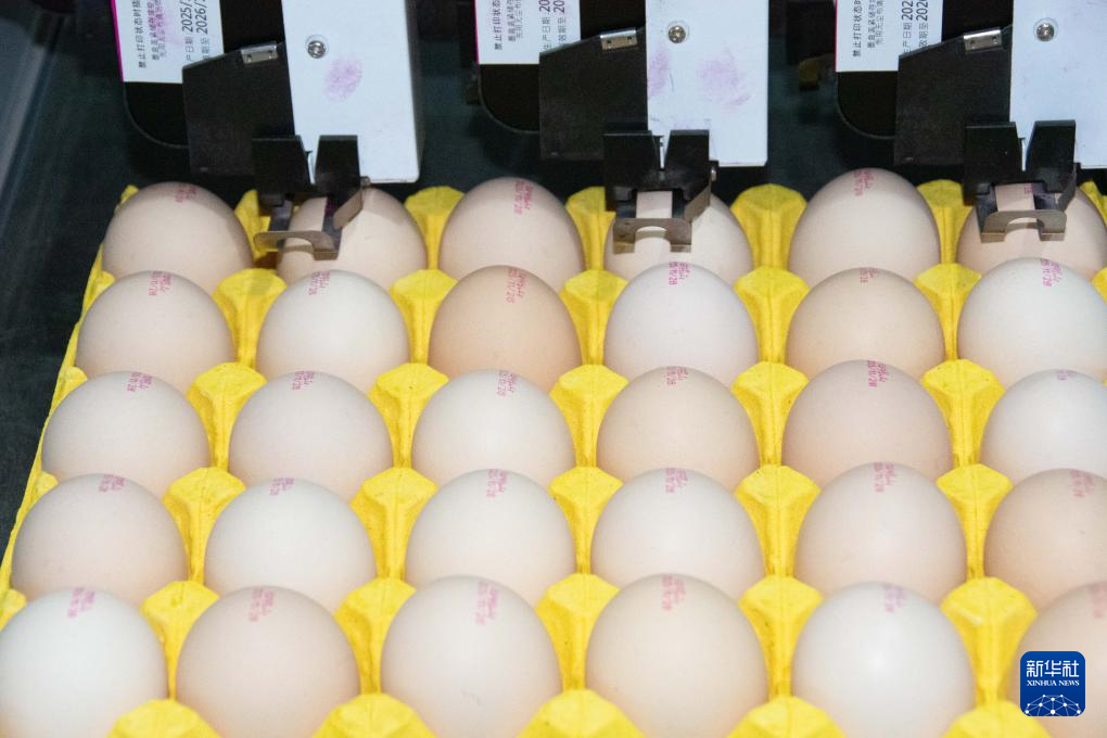 11月28日,在冷水灘區一雞蛋分揀中心,清洗殺菌後的雞蛋被打上生産日期和品牌標誌。新華社記者 柳王敏 攝