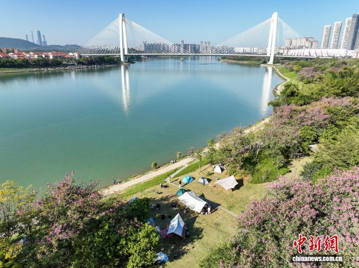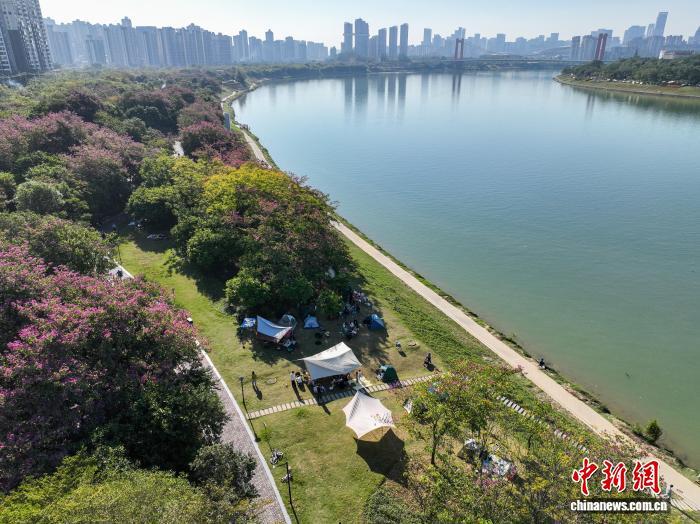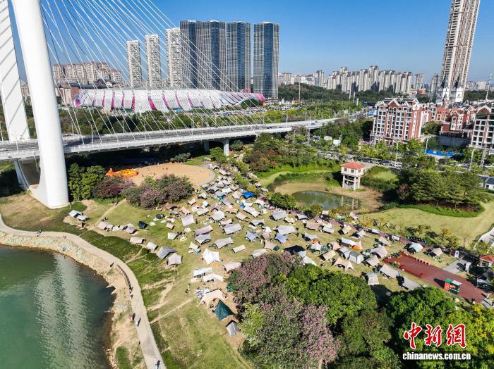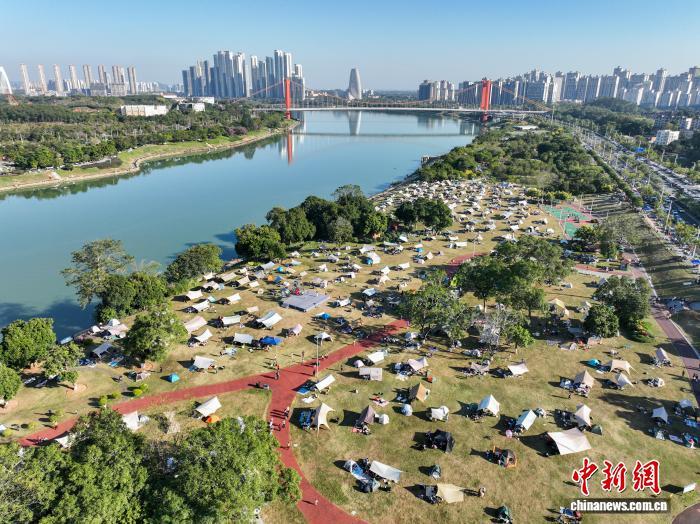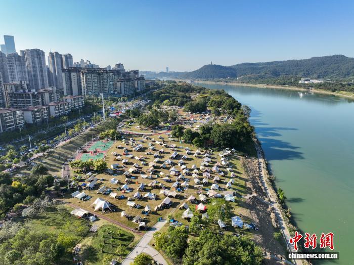 11月29日,广西南宁,不少市民趁好天气来到邕江边风景宜人处露营,享受周末时光。(无人机照片)中新社记者 陈冠言 摄