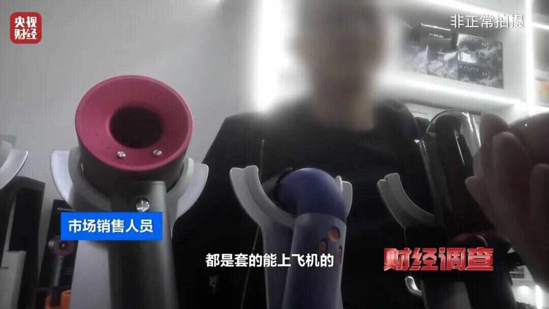 OCR:央视 非正常拍摄 财经 晓闻智电子经营部销售人员 它没有3C 财经调查 财经调查 上不了飞机 除此之外 财经调查 哪都没有问题 财经调查