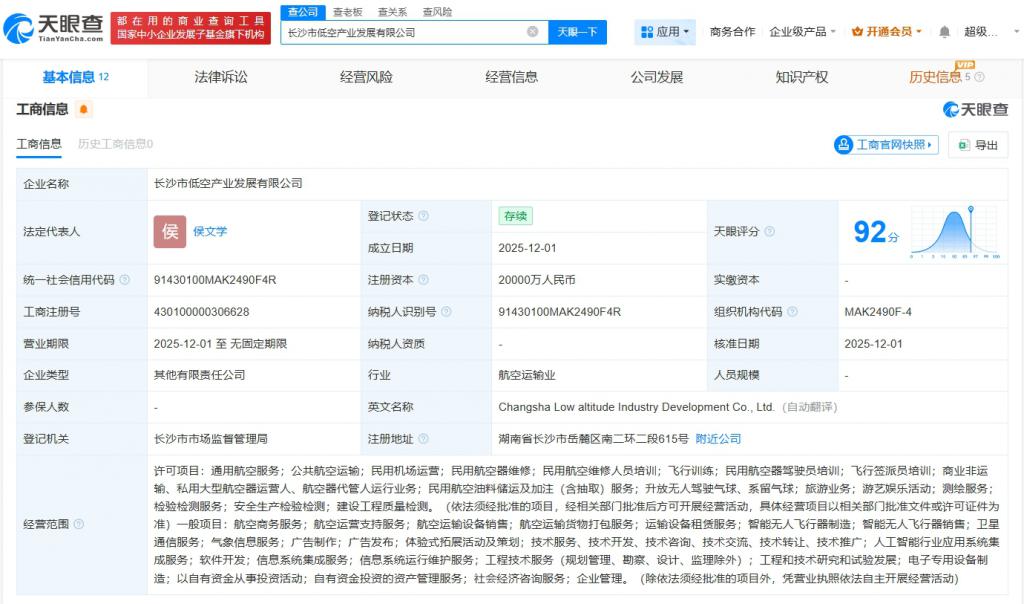 OCR:天眼查 都在用的商业查询工具 查公司 蚕老板查关系查风险 长沙市低空产业发展有限公司 大阳 应用 商务合作企业吸产品 开通会员 基本信息12 法律诉讼 经营风险 经营信息 公司发展 知识产权 历史信息 工商信息 天眼查 工商信息 历史工商信息 出 企业名称 长沙市低空产业发展有限公司 登记状态 存续 法定代表人 文学 天眼评分 92分 成立日期 2025-12-01 统一社会信用代码 91430100MAK2490F4R 注册资本 20000万人民币 实缴资本 工商注册号 430100000306628 纳税人识别号@ 91430100MAK2490F4R 组织机构代码 MAK2490F-4 营业期限 2025-12-01至无周定期限 纳税人资质 核准日期 2025-12-01 企业类型 其他有限责任公司 行业 航空运输业 人员规模 参保人数 英文名称 Changsha Low alttude Industry Development Co.,Ltd(自i动邮率) 登记机关 长沙市市场监督管理局 注册地址 湖南省长沙市岳第区南二环二段615号附近公司 许可项目:通用航空服务:公共航空运输;民用机场运营:民用航空器维修:民用航空维修人员培训:飞行训练:民用航空器骂驶员培训:飞行签派员培训:商业非运 输、私用大型航空器运营人、航空器代管人运行业务:民用航空油料健运及加注(含抽取)服务:升放无人驾驶气球、系留气球:成游业务:讲艺娱乐活动:测绘服务: 检验检测服务:安全生产检验检测:建设工程质量检测,(依法须经批准的项目,经相关部门批准后方可开展经营活动,具体经营项目以相关部门批准文件或许可证件为 经营范围 准)一般项目:航空商务服务:航空运营支持服务:航空运输设备销售:航空运输货物打包服务:运输设备租赁服务:智能无人飞行器制造:智能无人飞行器销售:卫星 通信服务:气象信息服务:广告制作:广告发布;体验式拓展活动及策划:技术服务、技术开发,技术咨询、技术交流、技术转让、技术推广:人工智能行业应用系统集 成服务:软件开发:信息系统集成服务:信息系统运行维护服务:工程技术服务(规划管理、部察、设计、监理除外):工程和技术研究和试验发展:电子专用设备制 造:以自有资金从事投资活动:自有资金投资的资产管理服务:社会经济咨询服务:企业管理。(除依法须经批准的项目外,凭营业执照依法自主开展经营活动)