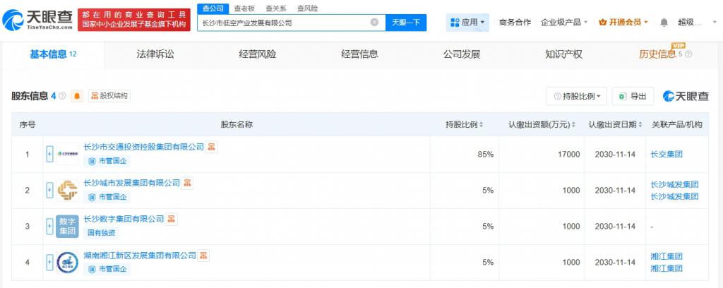 OCR:天眼查 都在用的商业查询工具 查公司 查电板查关系查风险 下 长沙市低空产业发展有限公司 天一下 应用 商务合作企业级产品 开通会员 基本信息12 法律诉讼 经营风险 经营信息 公司发展 知识产权 历史信息 Via 股东信息4 属股权结构 持股比例 导出 天眼查 序号 股东名称 持股比例: 认缴出资额(万元): 认缴出资日期: 关联产品/机构 长沙市交通投资控股集团有限公司显 市管国企 85% 17000 2030-11-14 长交集团 长沙城市发展集团有限公司 5% 1000 2030-11-14 长沙城发集团 市营 长沙减发集团 长沙数字集团有限公司 国有 5% 1000 2030-11-14 湖南湘江新区发展集团有限公司 5% 1000 2030-11-14 湘江集团 告管国品 雅江集团