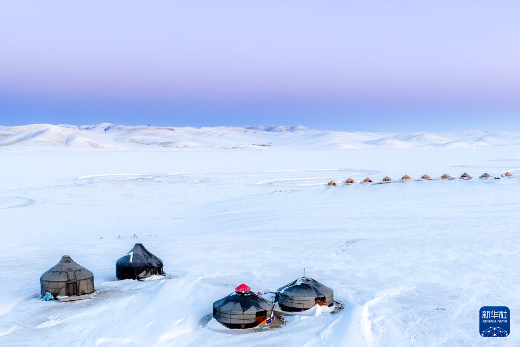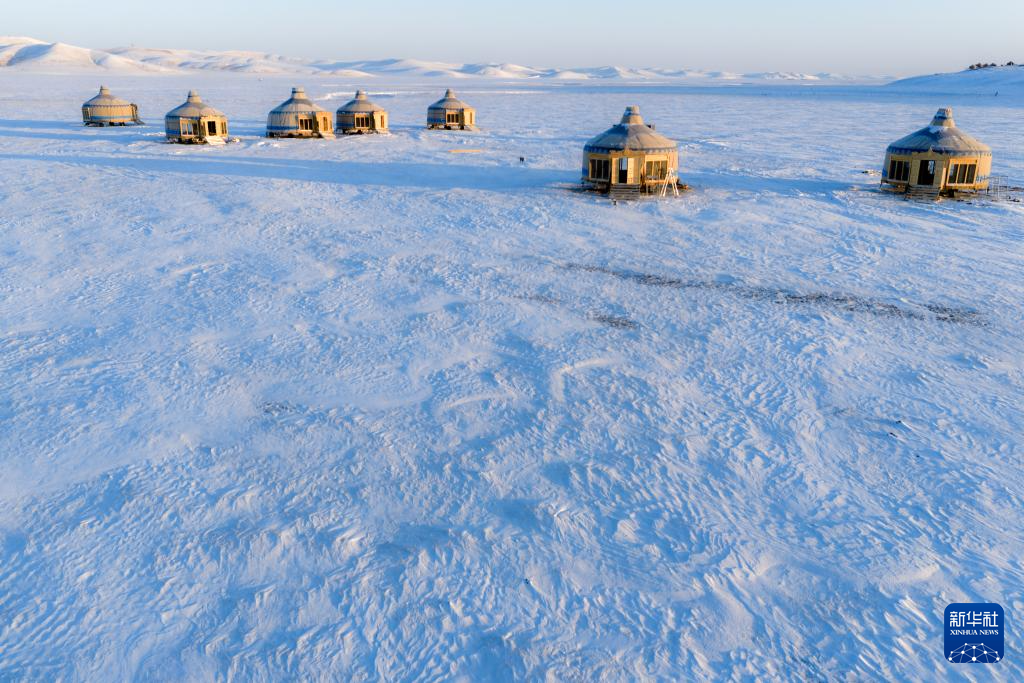 这是12月3日在内蒙古呼伦贝尔市陈巴尔虎旗拍摄的雪原上的蒙古包(无人机照片)。