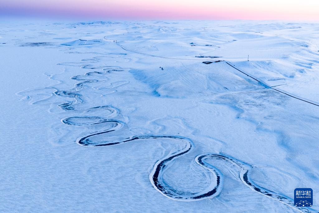这是12月3日在内蒙古呼伦贝尔市陈巴尔虎旗拍摄的流经雪原的莫尔格勒河(无人机照片)。