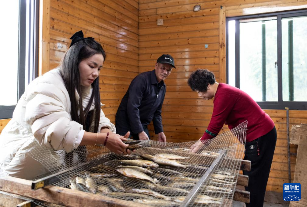 12月3日,赤溪村村民(右一)在向游客展示他养殖的中华倒刺鲃。