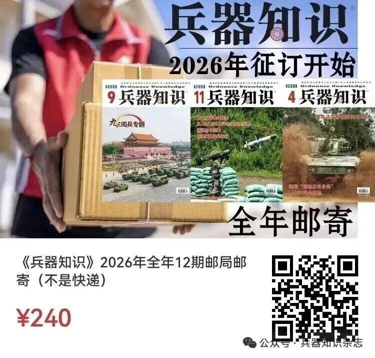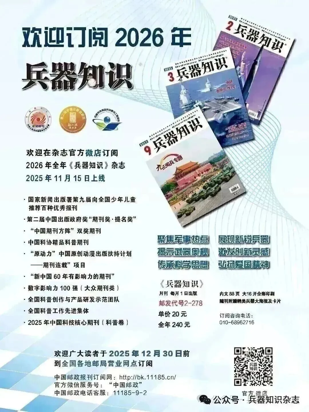 OCR:2兵器知识 欢迎订阅2026年 兵器知识 FOTS 兵器知识 3 限 有强 欢迎在杂志官方微店订阅 9兵器知识 2026年全年《兵器知识》杂志 九三调兵专题 2025年11月15日上线 ·国家新闻出版署第九届向全国少年儿童 推荐百种优秀报刊 ·第二届中国出版政府奖“期刊奖·提名奖” “中国期刊方阵”双奖期刊 聚焦军事热点 展现新锐兵器 ·中国科协精品科普期刊 “原动力”中国原创动漫出版扶持计划 揭示武器奥秘 激发创新灵感 — 一期刊连载”项目 传承科学思想 弘扬爱国精神 “新中国60年有影响力的期刊” 《兵器知识》 ·数字影响力100强(大众期刊类) 月刊每月1日出版 内文88页大16开全彩印刷 ·全国科普创作与产品研发示范团队 邮发代号2-278 随刊附赠精美兵器大海报及卡片 ·全国科普工作先进集体 单价20元 订阅咨询电话: 2025年中国科技核心期刊(科普卷) 全年240元 010-68962716 欢迎广大读者于2025年12月30日前 到全国各地邮局营业网点订阅 中国邮政报刊订阅网:http://bk.11185.cn/ 官方微信服务号:“中国邮政” 中国邮政电话客服:11185-9-2 公众号·宾器知识杂志 官方微店