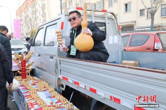 12月8日,商户在曹洼大集展示葫芦产品。曹洼大集,设在山东省临沂市临沭县,地处鲁南地区,赶大集的传统流传了50余年。近期,曹洼大集凭借超高性价比的特色美食、浓郁醇厚的民俗氛围、线上线下联动的鲜活场景火爆全网,成为现象级地标。中新社记者 祁建月 摄