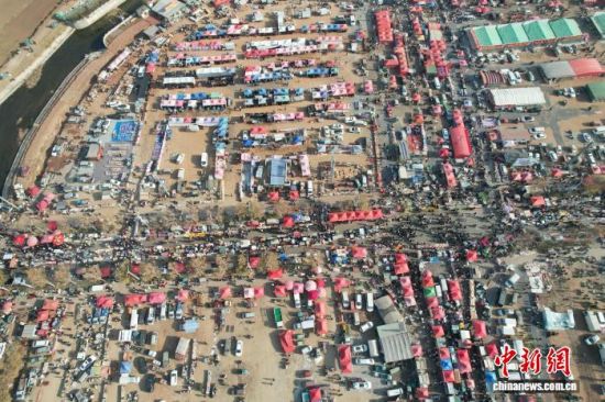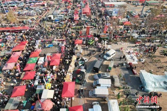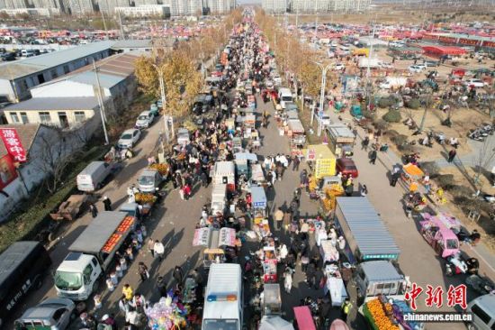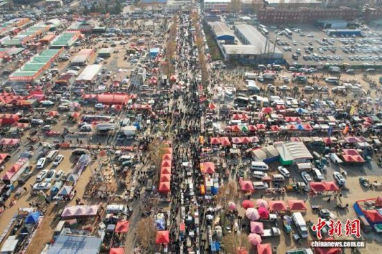 12月8日,民众畅游曹洼大集。曹洼大集,设在山东省临沂市临沭县,地处鲁南地区,赶大集的传统流传了50余年。近期,曹洼大集凭借超高性价比的特色美食、浓郁醇厚的民俗氛围、线上线下联动的鲜活场景火爆全网,成为现象级地标。 (无人机照片)中新社记者 王峰 摄